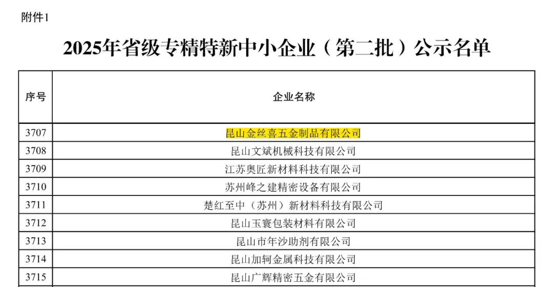 Slovenski Baru-baru ini, Jabatan Industri dan Teknologi Maklumat Wilayah Jiangsu secara rasmi mengumumkan kumpulan terbaru PKS Jiangsu Khusus dan Canggih yang diiktiraf untuk tahun 2025. Kunshan Jinsixi Metalware Co., Ltd. telah berjaya dipilih dan dianugerahkan gelaran "PKS Khusus dan Canggih Jiangsu" disebabkan oleh pengumpulan teknikal yang mendalam dalam kualiti produk yang sangat cepat, subnosen yang berterusan.
